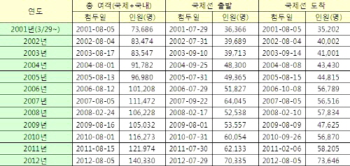 | 개항 이후 연도별 첨두일(일주일 중 교통량이 가장 많은 요일) 이용객수. | ||