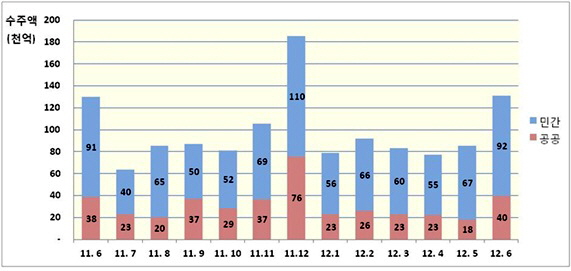 민간부문수주는 토목이 공공부문과 마찬가지로 민간발전시설과 민자도로 발주가 이어지며 전년동기 대비 36.4% 증가했다. 건축도 세종시, 혁신도시 등 공공기관 이전지역을 중심으로 주거용이 견조한 증가세를 보이며 비주거용 건축부진에도 불구, 전년동기대비 3.8% 늘었다.