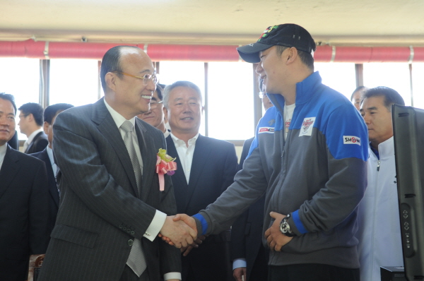 | 김승연 회장의 사격 지원은 런던올림픽에서의 '금메달 3개와 은메달 2개'라는 괄목한 괄목할 성장을 이끌어 냈다(사진은 김승연 회장이 2010년5월 한화회장배 전국사격대회에서 진종오 선수를 격려하는 모습). | ||
