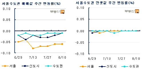 부동산114에 따르면, 8월 둘째주 아파트 매매시장은 △서울(-0.06%) △신도시(-0.01%) △수도권(-0.01%) 모두 하락했다. 반면 전세시장은 소형아파트와 대중교통 환경이 우수한 지역위주로 소폭 상승했다.