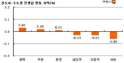 수도권에서는 과천(-0.07%)의 하락폭이 가장 컸다. 이어 △남양주(-0.02%) △부천(-0.02%) △의정부(-0.02%) △수원(-0.02%) △화성(-0.02%) 등이 소폭 감소했다.