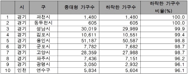 | 수도권 중대형아파트 하락 가구수 비율 Top10 지역. | ||