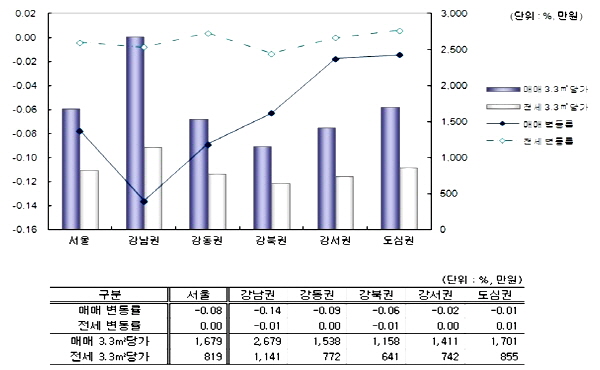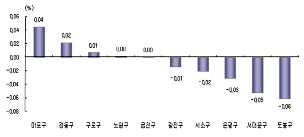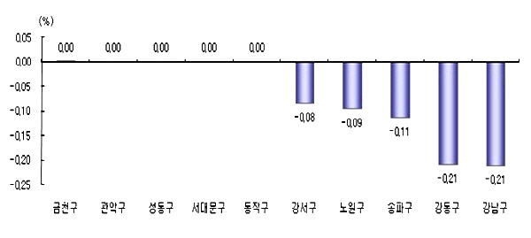 부동산정보업체 ㈜부동산써브에 따르면 8월 셋째 주 서울 매매가 변동률은 -0.08%를 기록했다. △강남구(-0.21%) △강동구(-0.21%) △송파구(-0.11%) △노원구(-0.09%) △강서구(-0.08%) △도봉구(-0.08%) △중랑구(-0.07%) △강북구(-0.07%) △서초구(-0.05%) △마포구(-0.03%) 순으로 내렸으며, 오른 곳은 단 한곳도 없었다.