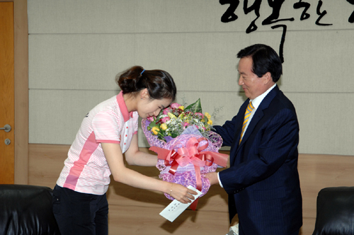 | 강운태 광주광역시장이 지난 2010년 9월 13일 시청 접견실에서 국제양궁연맹 양궁월드컵 4차대회에서 3관왕을 차지한 시청소속 기보배 선수를 격려하고 있다. | ||