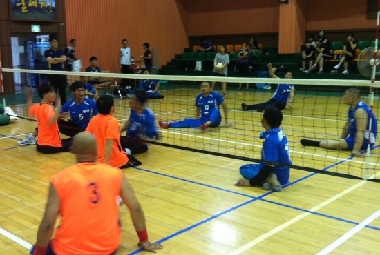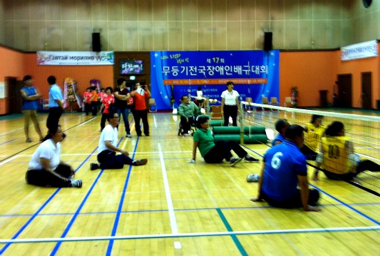 18일 몽골 울람바트 여자팀과 광주시장애인배구협회 임원들이 친선 경기를 벌이고 있다.