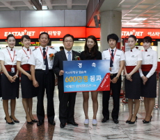 이날 행운의 600만 번째 고객은 대만으로 가는 ZE887편에 탑승한 김영지(28세, 회사원)씨로 김포-송산(타이베이) 국제선을 이용하다 행운을 거머쥐었다.