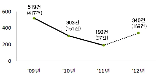 | 2009~2012년 입찰방법 심의현황. * ( )는 해당년도 상반기 심의현황, ‘12년도 전체 건수는 예상치. | ||