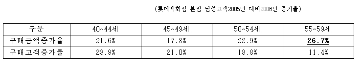 실제로 롯데백화점 본점의 2005년 대비 2006년, 40세부터 59세까지 남성고객의 구매금액은 22.2% 증가했고 구매고객수는 16.3% 증가한 것으로 나타났다.