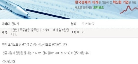 | 프리보드 시장 폐지를 따지는 투자자의 질문에 프리보드 홈페이지 게시판 관리자가 정상적으로 운영 중이라는 답변을 하고 있다. | ||