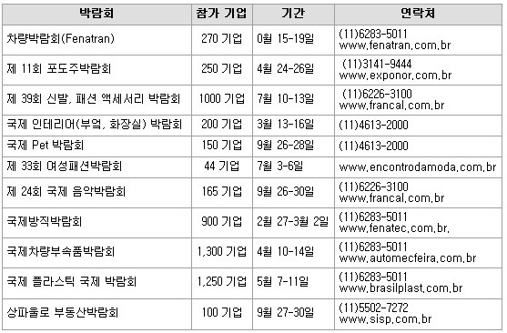 지난해 브라질에서 122개 박람회가 개최됐으며 3만 1천 기업들이 13만개의 제품을 소개했다. 기업과 소비자들, 방문객들을 모두 합해 5백만여 명이 참가했으며 이 중 4만 2천여 명은 외국 구매자들이었다.