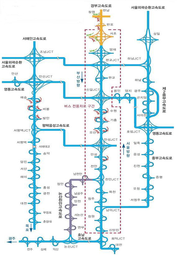 버스전용차로의 경우 경찰청은 2월16일 12시부터 2월19일 24시까지 경부고속도로 서초IC~신탄진1C(137km)구간 상·하행선에서 6인 이상 탑승한 9인승 이상 승용·승합차만 진입을 허용하기로 했다. 서울은 남부시외버스터미널~서초IC구간(0.5km)과 사평로 삼호가든사거리~반포IC구간(0.6km) 양방향에서 임시 버스전용차로제를 시행한다.