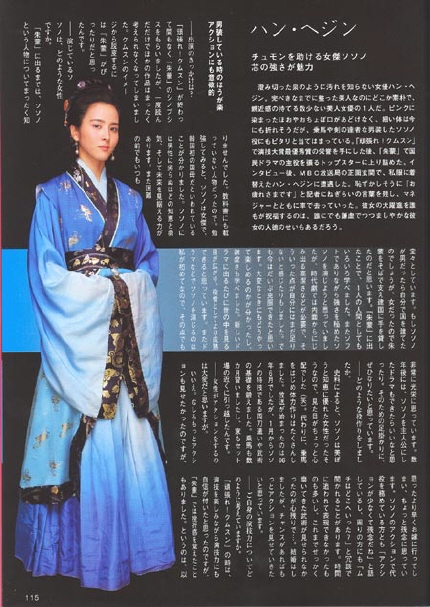 소서노 역을 맡고 있는 한혜진에 대해서는 “심지가 강한 것이 매력이다. 너무나 맑은 우물같이 맑음만을 아는 여배우란 생각이다”며 “완벽하다고 말할 정도의 미인임에도 불구하고 소박하고 친근감을 갖고 있는 상당히 드문 여배우중하나이다”라고 극찬을 아끼지 않았다.