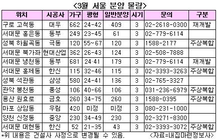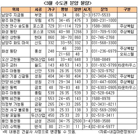 16일 내집마련정보사(www.yesapt.com)에 따르면, 서울이 약 1783가구, 경기·인천지역이 9534가구, 지방이 2만4958가구가 일반 분양되는 것으로 조사되었다. 2월에 비하면 4배 가량 늘어난 것이다.