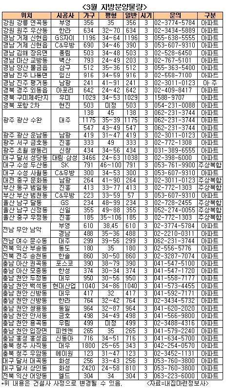 함영진 팀장은 “지방은 부동산 시장이 침체 돼 있고 1·2월 분양 단지가 없었기 때문에 3월 분양에서 어느 정도 성공을 거둘 수 있을지 지켜봐야