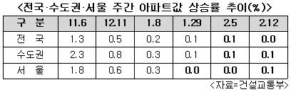 건교부에 따르면 매매시장의 경우 ‘1.11대책’ 이후 강남 3구의 주간 아파트가격이 최근 3주 연속 하락했으며, 강북 14구도 주간 0.1% 수준의 안정세를 보였다. 지재건축 아파트는 지난달 22일 이후 4주 연속 하락한 것으로 나타났다.