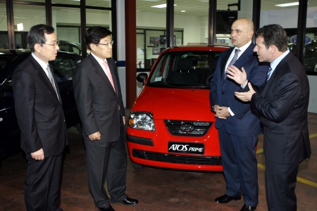 16일(한국시간) 노무현 대통령의 이탈리아 국빈 방문을 수행 중인 김영주 산자부 장관(왼쪽 두 번째)이 현대자동차 최재국 사장(왼쪽 첫 번째)과 함께 로마 시내에 위치한 현대자동차 딜러점을 방문, 딜러점 사장으로부터 현대차 현지 판매 현황 및 시장 현황에 대한 설명을 듣고 있다.(현대차 제공)