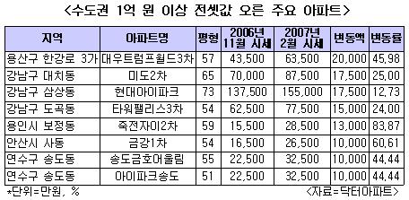 전셋값이 억대 이상 오른 경우 서울은 실거래가라기보다는 호가인 경향이 높지만, 경기와 인천의 경우는 실제 거래되면서 전셋값이 오른 경우다.