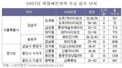 이들 버블세븐지역의 2월 이후 2007년 입주물량을 스피드뱅크(www.speedbank.co.kr)가 조사한 결과 26개 단지 1만2551가구인 것으로 집계됐다. 월별 입주량으로 보면 8월이 4230가구로 가장 많았고 6월은 입주단지가 한 곳도 없었다.