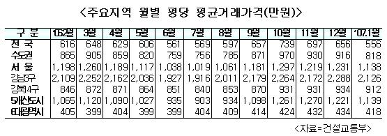 한편 강남 3구의 경우 지난해 2월 평당 평균 2109만원이었으며, 7월에 1916만원으로 떨어졌다가 다시 올라 지난 1월 2126만원을 기록한 것으로 나타났다.
