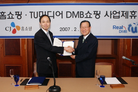 대표이사(우)가 참석한 가운데, 위성 DMB 쇼핑 사업 제휴 체결 조인식이 진행됐다.