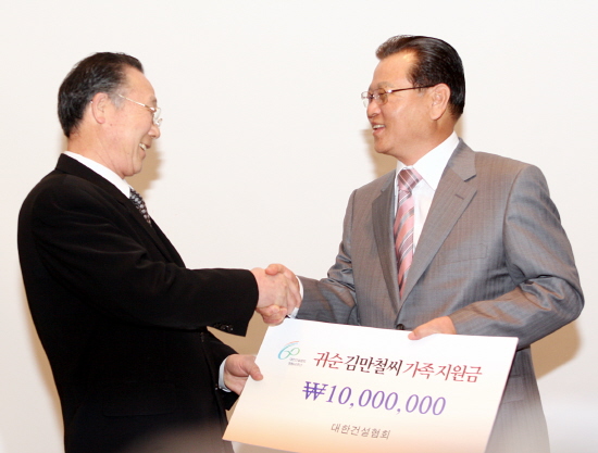 또 지난해 ‘연말연시 이웃돕기 건설인 음악회’를 통해 모금한 성금 중 1000만 원을 지난 87년 귀순한 김만철씨 가족에게 전달했다. 김씨는 이달 초 일부 언론을 통해 극심한 생활고를 겪고 있는 것으로 보도되어 이번에 건협이 ‘이웃사랑, 나눔의 실천’행사의 일환으로 지원하게 된 것이다.
