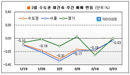 닥터아파트(www.DrApt.com)가 2월 한 달간 재건축 아파트 매매가 변동률을 조사한 결과 전국 -0.60%, 수도권은 -0.64%를 나타냈다. 서울 재건축 매매가 변동률은 -0.71%로 지난달(0.03%)보다 0.74%포인트나 하락하며 6개월 만에 마이너스 변동률을 보였다.