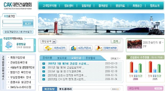 [프라임경제]대한건설협회(회장 권홍사)가 2일부터 협회 홈페이지(www.cak.or.kr)내에 회원사들을 위한 ‘제도개선 의견수렴’란을 신설하는 등 홈페이지를 대폭 개편해 서비스에 들어갔다고 밝혔다.