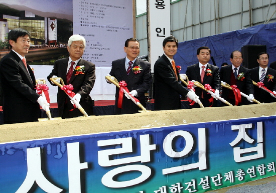 대한건설단체총연합회(회장 권홍사)와 용인시는 8일 용인시 처인구 김량장동 소재 ‘용인 사랑의 집’ 건설부지에서 이춘희 건교부차관, 서정석 용인시장, 권홍사 건단련 회장, 최영철 건설공제조합 이사장 등 건설단체장과 건설CEO 등 100여명이 참석한 가운데 ‘용인 사랑의 집’ 기공식을 가졌다.