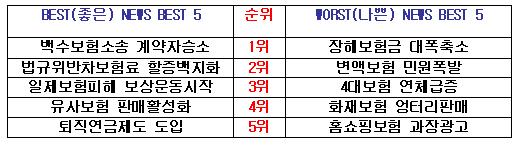 또한 손보업계가 틈만 나면 제도변경을 들고나와 자동차보험료를 올리려 했지만 소비자의 강력한 반대에 부딪혀 결국 뜻을 이루지 못한 ‘법규위반 차보험료 할증백지화’가 2위를 차지했다.