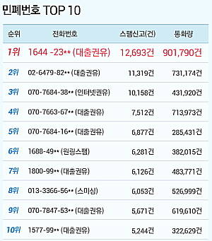 이중 통화량이 가장 많은 번호는 민폐번호 1위인 '1644-12XX'번으로 2분기 총 통화량은 90만1790건(일평균 1만19건)이었다.
