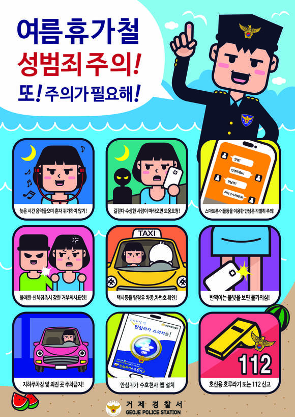 [프라임경제] 경남 거제경찰서(서장 이희석)는 7월16일 관광지인 거제도에서 여름 휴가철 피서객들이 즐거운 휴가 기간을 보낼 수 있도록 성범죄 예방 수칙 포스터를 제작·배포했다.