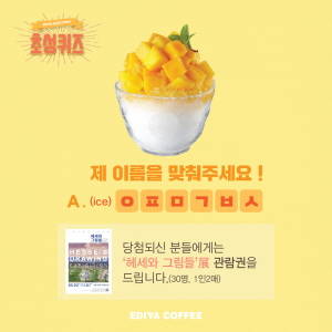 오는 20일부터 23일까지 이디야커피 빙수 이름을 댓글로 달면 이벤트에 응모할 수 있다. 이벤트 참여 고객을 대상으로 추첨을 통해 30명에게 '헤세와 그림들'展 관람권을 2매씩 증정하며 당첨자는 24일 발표된다.