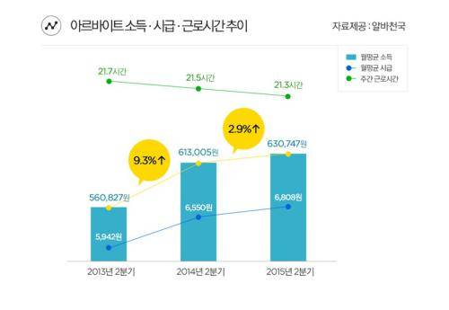 아르바이트 전문포털 알바천국(대표 최인녕)은 전국 남녀 아르바이트생 5077명의 월평균 총소득과 근무시간을 조사한 '2015년 2분기(4~6월) 알바소득지수 동향' 분석 결과를 20일 발표했다.