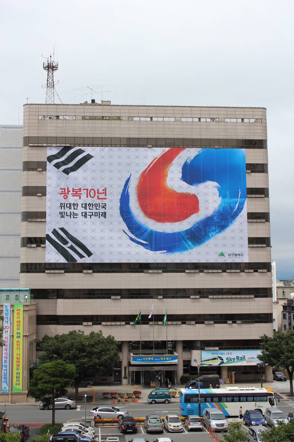 [프라임경제] 대구시(시장 권영진) 청사 외벽이 대형 태극기로 온통 뒤덮였다.