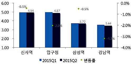 [프라임경제] 올 2분기 서울 상권 임대료는 내수침체와 메르스 여파 탓에 대부분 마이너스 변동률을 나타냈다. 강남권 월 임대료는 △신사역 -0.5% △삼성역 -0.5% △압구정 -2.0% △강남역 -3.2% 순으로 하락률이 컸다.
