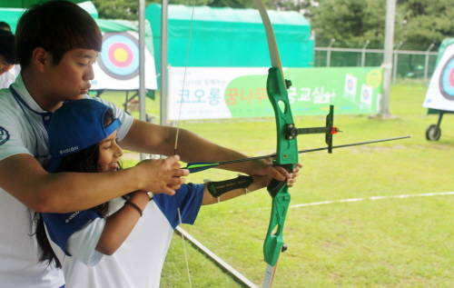 이날 양궁교실에는 코오롱 서오석 감독과 2015광주유니버시아드 대회 3관왕을 달성한 세계랭킹 1위 이승윤 선수, 베이징올림픽 금메달리스트인 이창환 선수 등 코오롱 소속 선수들이 동참했다.