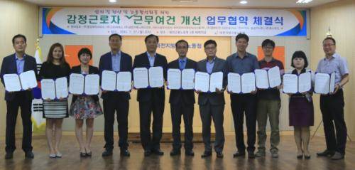 대전지방고용노동청(이하 대전고용청)과 지역 10개 컨텍센터(콜센터)는 27일 대전고용청에서 감정근로자 근무 여건 개선을 위한 업무협약을 체결, 감정근로자의 직무만족도를 높이는 사업을 실시하기로 했다.