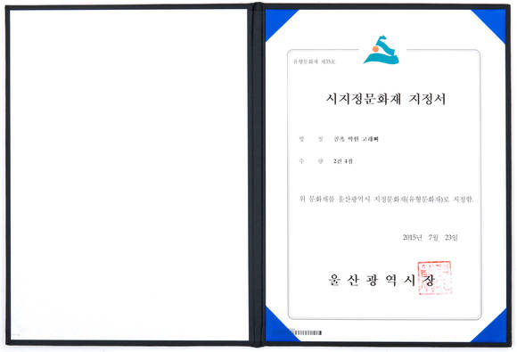 이 유물은 2009년 울산 신항만부두 연결도로 부지 발굴 조사 중 출토. 2013년 2월 울산시에 국가귀속 조치돼 이후 박물관에서 소장하고 있다. 2015년 2월 시지정문화재 지정 신청에 이어 지난달 23일 유형문화재 제35호로 지정됐다.