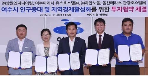 11일 여수시청 상황실에서 열린 협약식에는 주철현 여수시장을 비롯해 박영금 ㈜상원엔지니어링 대표이사, 김류형 여수마리나 유스호스텔㈜ 대표이사, 김지현 ㈜하얀노을 대표이사, 정용현 돌산 테라스 관광호스텔㈜ 대표이사 및 기업관계자 등이 참석했다.