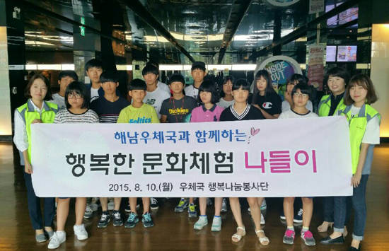 이날 해남우체국 행복나눔 봉사단원들은 부모 없는 불우한 아동·청소년과 함께 영화를 관람하고, 점심식사를 하면서 즐겁게 얘기를 나눴다.