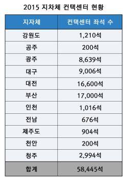 콜센터 좌석 수가 가장 많은 지역은 1만7000석을 보유한 '부산'이었으며 계속해서 △대전(1만6600석) △대구(9006석) △광주(8639석) 등이 뒤따랐다.