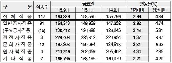 31일 대한건설협회(회장 최삼규)에 따르면 9월1일 공표 기준 올 하반기 건설 직종 일 평균 임금은 16만3339원으로, 전년대비 4.84%·전반기 대비 2.99% 올랐다.