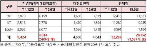 국회 미래창조과학방송통신위원회 소속 유승희 새정치민주연합 의원이 미래창조과학부로부터 제출받은 국정감사 자료에 따르면 이통3사 직영점은 지난해 12월 8424개에서 올해 6월 9014개로 590개(7%) 늘었다. 반면, 영세 판매점은 같은 기간 3만2289개에서 2만8752개로 3537개(11%) 줄어들었다.