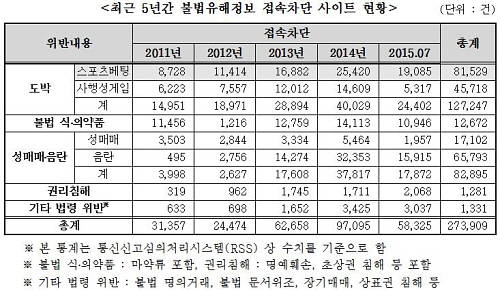 2일 국회 미래창조과학방송통신위원회 소속 장병완 새정치민주연합 의원이 방심위로부터 제출받은 자료를 보면 최근 5년간 차단된 불법유해정보 접속차단 사이트는 총 27만3000건이며 이 중 도박 관련 사이트가 12만7000건으로 전체 46.5%를 차지했다.