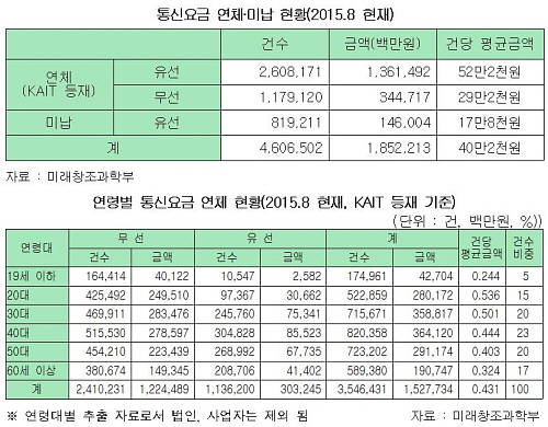 이 자료를 보면 통신요금 연체로 한국정보통신진흥협회(KAIT)의 '통신요금미납자 관리 데이터베이스(DB)'에 등재된 건은 지난달 기준 378만7291건, 금액은 1조7062억원이다.