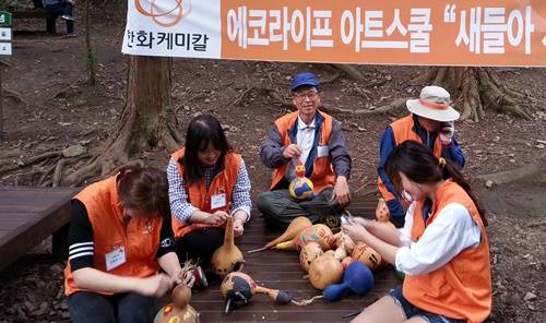 한화케미갈 여수공장 사회봉사대는 지난 19일 여수지역아동센터 아이들 40여명과 전남 여수시 봉화산 수목원에서 새들을 보살피는 제5차 에코라이프아트스쿨 '새들아 사랑해' 행사를 전개했다.