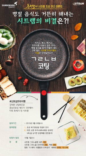 추석 명절 음식 만들기를 손쉽게 도와줄 삼광글라스㈜의 쿡웨어 '시트램 그라노블 프라이팬' 관련 퀴즈 정답을 댓글로 작성해 응모할 수 있고, 이웃을 소환하거나(@닉네임) 이벤트 소식을 공유한 URL을 함께 남기면 당첨 확률이 높아진다.