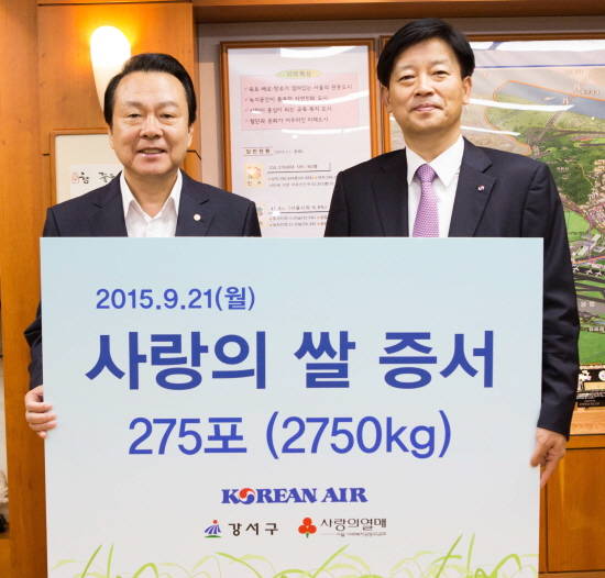 대한항공은 추석 명절을 맞아 강서지역 이웃들을 위해 쌀 10kg 275포를 강서구청에 기증한다. 기증된 쌀은 지역 내 관할 복지시설 15곳을 통해 △독거노인 △소년소녀가장 △장애인들에게 전달될 예정이다.