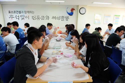 포스코건설(사장 황태현)은 22일 황 사장을 비롯한 임직원 봉사자와 구세군 자선냄비본부 관계자 100여명과 함께 150여 다문화청소년이 재학 중인 인천한누리학교를 방문, 전통문화체험 및 송편만들기 봉사활동을 실시했다고 23일 밝혔다.