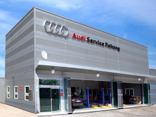 이곳은 연면적 859m²의 규모의 '아우디 서비스 포항'은 지상 2층의 아우디 서비스 전용 건물에 총 네 개의 워크베이를 갖춰 하루 16대의 차량 경정비가 가능하다.